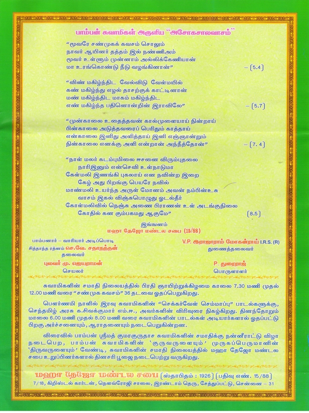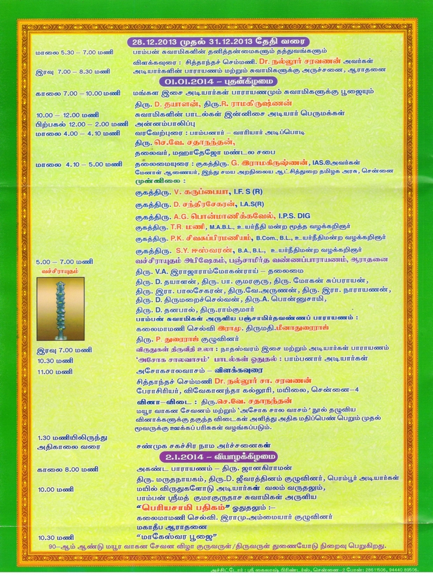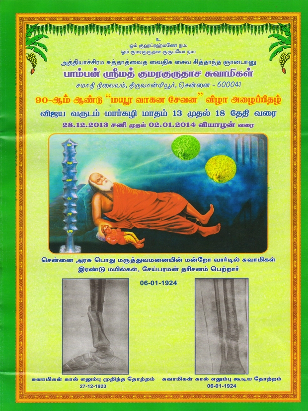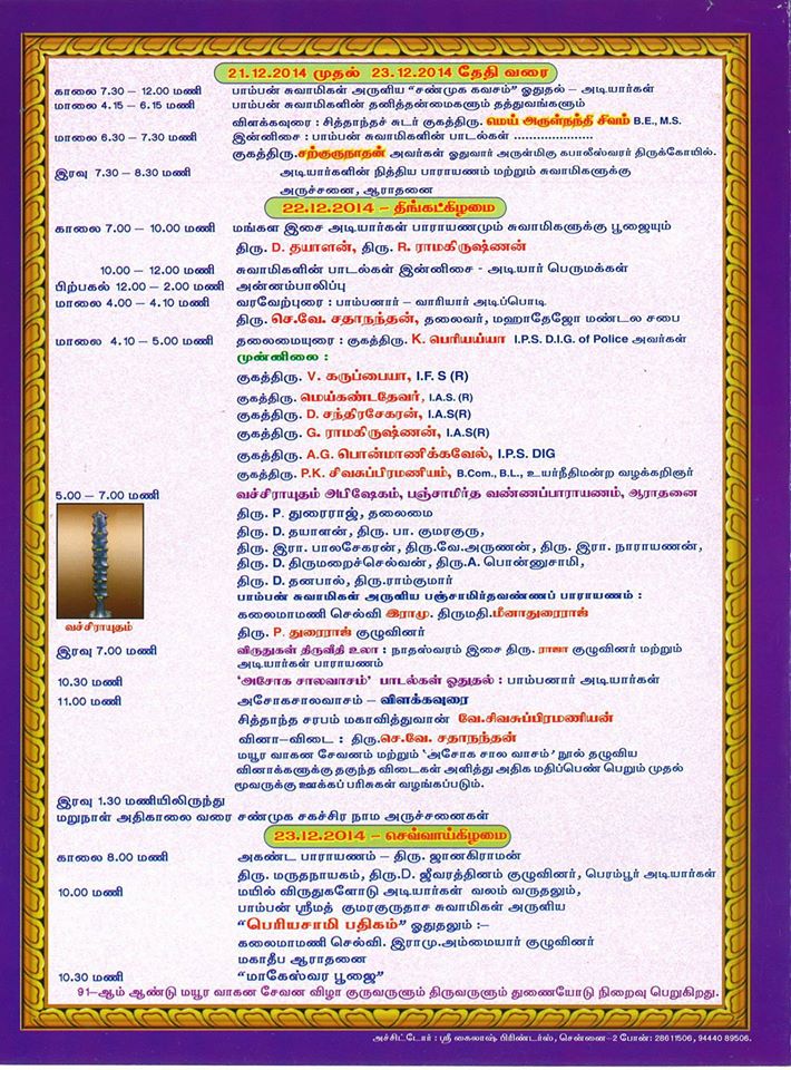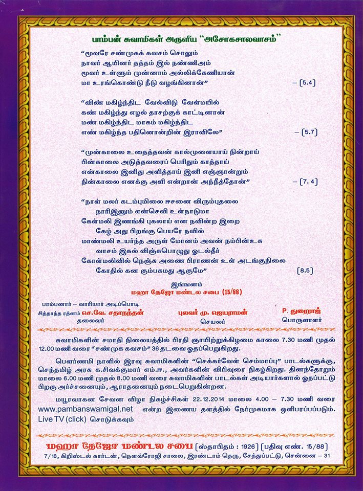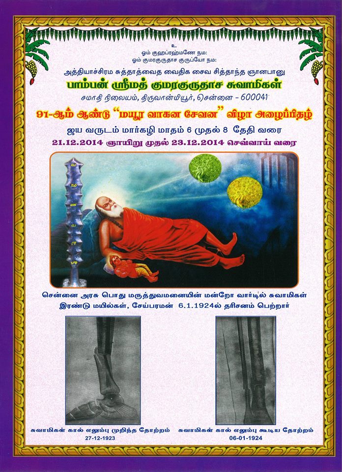 ஸ்ரீமத் பாம்பன் சுவாமிகள் கொண்டாடிய மயூர வாகன விழா 91வது வருடம் சுவாமிகளின் சமாதியில் 22.12.2014 அன்று நடக்க இருக்கின்றது. அன்பர்கள் அனைவரும் கலந்துக் கொண்டு சுவாமிகளின் அருள் பெறுமாறு அன்புடன் அழைக்கின்றோம். அர்ச்சனை செய்ய விரும்புவோர் மின்னஞ்ல் அனுப்பவும்.