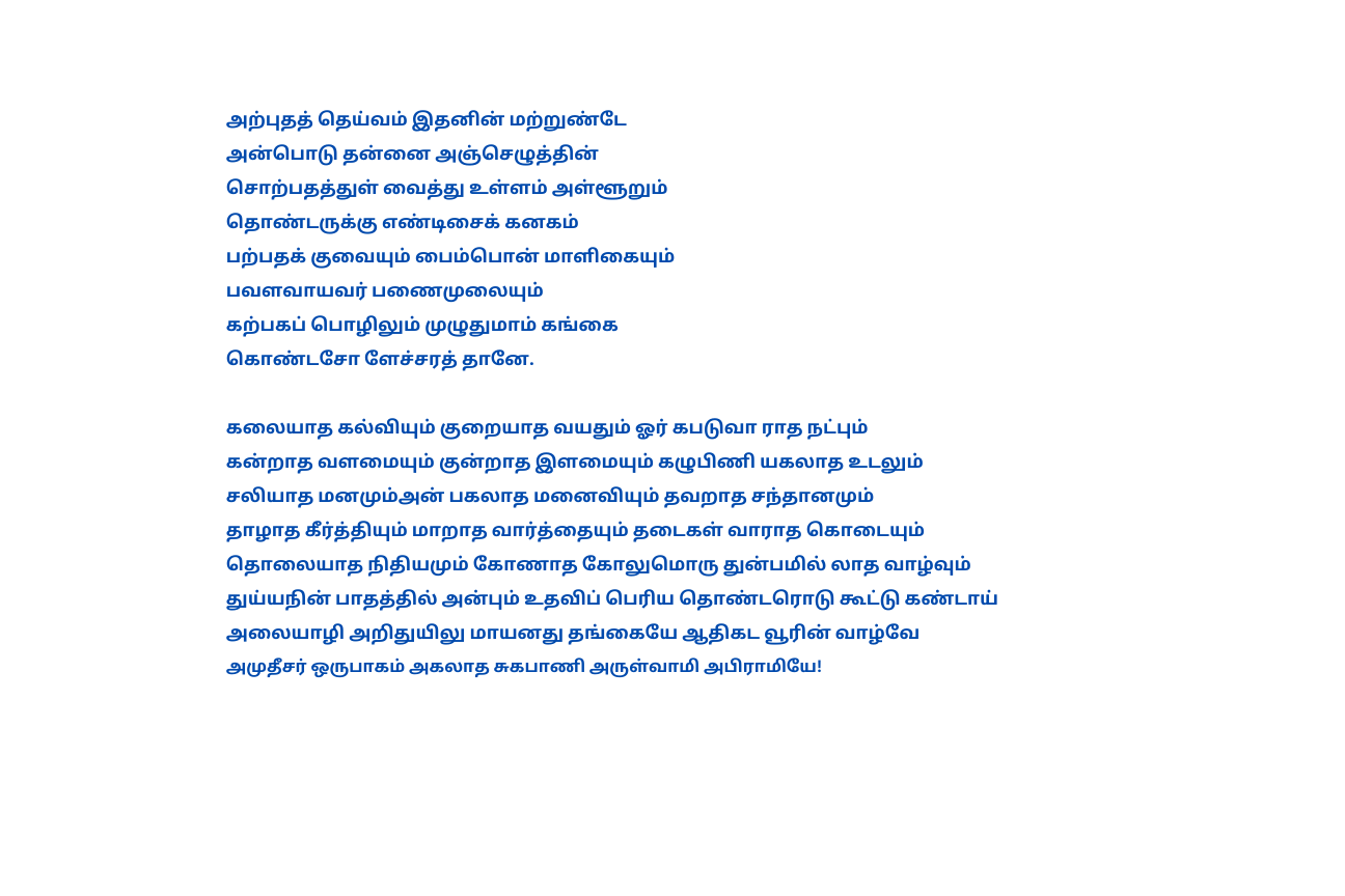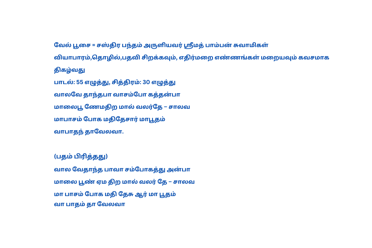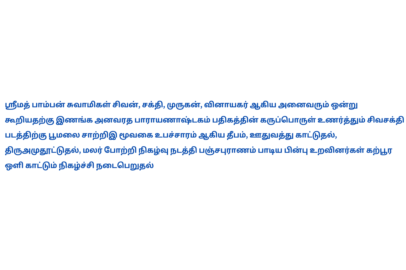 நால்வர் பாடிய தேவாரம், திருவள்ளுவர் இயற்றிய திருக்குறள், திருமூலர் அருளிய திருமந்திரம், அருணகிரிநாதர் அருளிய திருப்புகழ், மற்றும் ஶ்ரீமத் பாம்பன் சுவாமிகள் அருளிய பதிகங்கள் உள் அடக்கியதாகும்.