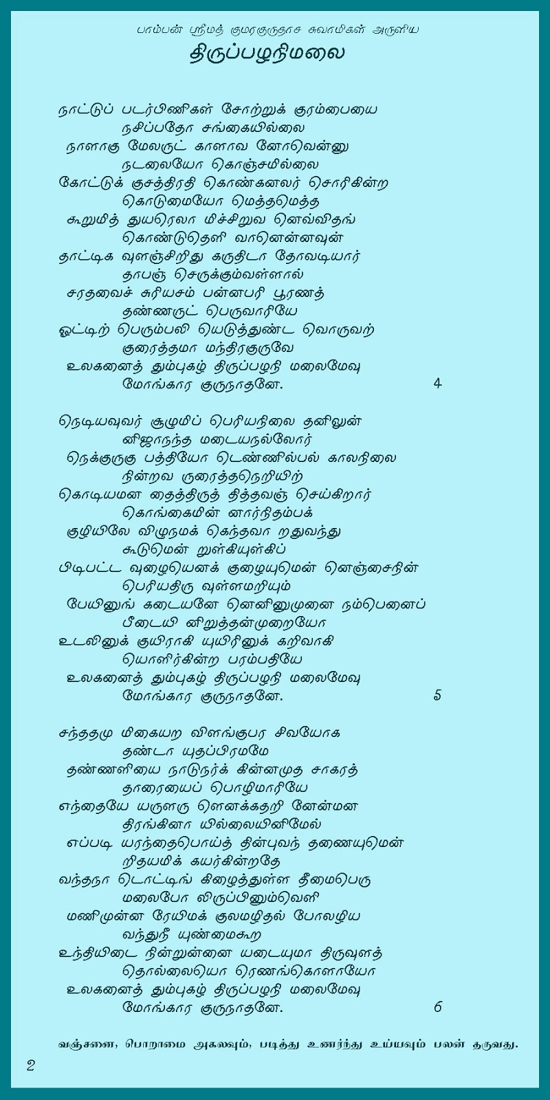 சித்தாந்த செல்வர், அருநூற்புலமை ஆன்றோர் பேராசிரியர் டாக்டர் ப. இராமன், அவர்களின் வழிக்காட்டுதல் பெயரில் இப் பாடல் என்னைப் போல் எளியவர் படிப்பதற்கு ஏற்றவாறு பிரித்து கொடுக்கப்பட்டுள்ளது. இவ்வாறு பிரித்து கொடுப்பது எளிய முறையில் கற்றுக் கொள்ளுவதற்க்கு மட்டும் தான் பயன்படுத்தப்பட வேண்டும். இத்துடன் இப்பாடல்களின் பொருள் கொடுக்கப்பட்டுள்ளது.