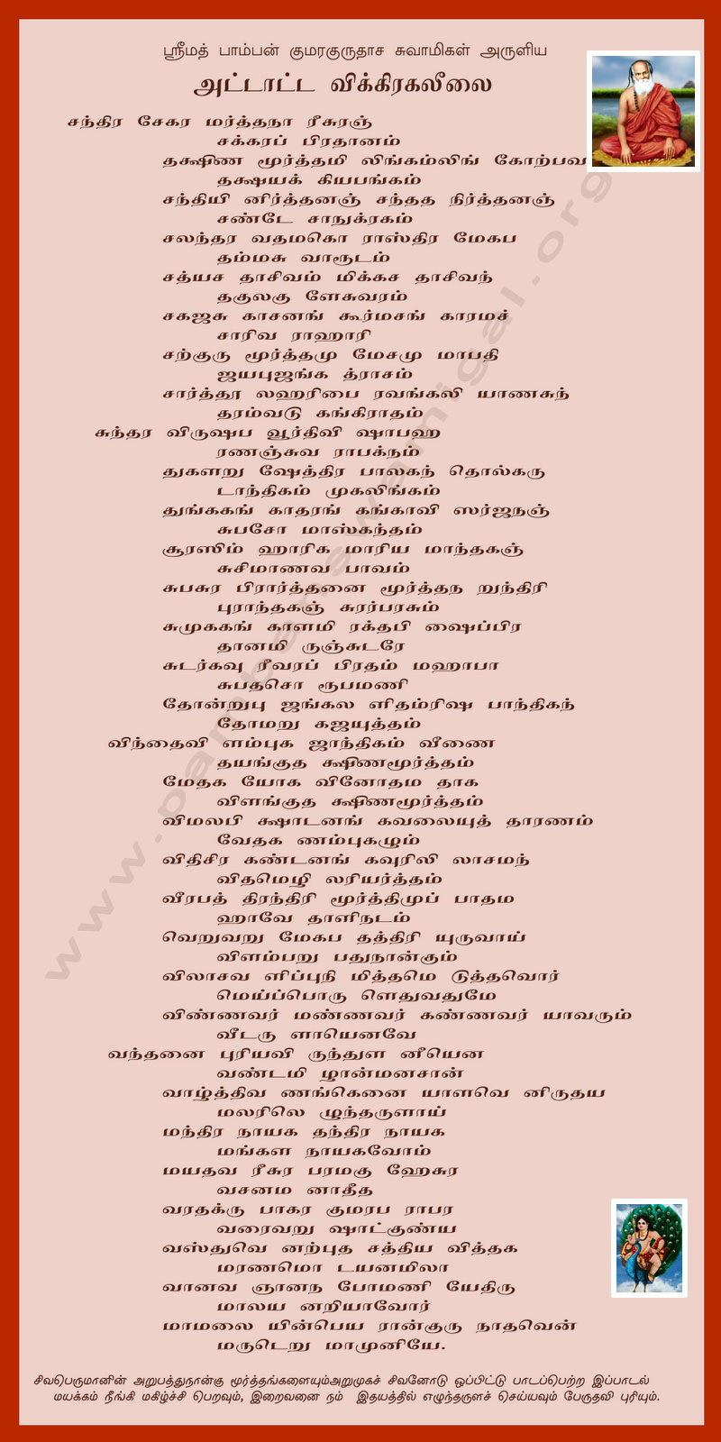 (முழு முதல்வன் ஆன சிவபெருமான் உயிர்கள் உய்திகருதி நிகழ்த்திய திருவிளையாடல்கள் பல, அவன் திருவிளையாடலில் கொண்ட திருமேனிகள் 64 என்பர். அவற்றைப் பேரருளாளரான ஸ்ரீமத் பாம்பன் சுவாமிகள் இப்பாடலில் உணர்த்துகின்றார். இப் பகுதி, கலியுகம் 5000க்குச் சரியான விளம்பி வருடம் (கி.பி 1898) சுவாமிகளால் பாடப்பட்ட 48 சீர் விருத்தமாகும். இது இறைவனின் 64 திருவிளையாடல்களைக் குறித்த விபரங்களை உள்ளடக்கியது. இப்பாடலில் குறித்த அறுபத்து நான்கு மூர்த்தங்களில், கொன்றை சூடிறைக்கும், கொவ்வைச் செவ்வாய்க் கோமள மாதுமைக்கும் நடுவே, சூர்தடிந்த சுடர்வேலோன் திகழும் கோலமாகிய சோமஸ்கந்த மூர்த்தம், சிறுத்தொண்டர் ஒருவருக்கு மட்டுமே அருளப்பட்ட காட்சியாகும். இறையின் இவ்வடிவை சிந்தை செய்து, வழிபட்டு வாழ்பவர் இல்லங்களில், நலம் பல திகழும் என்பது நல்லோர் வாக்கு.