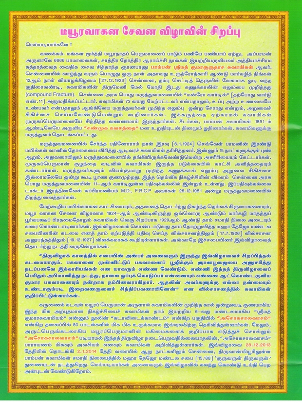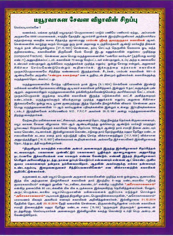 ஸ்ரீமத் பாம்பன் சுவாமிகள் கொண்டாடிய மயூர வாகன விழா 91வது வருடம் சுவாமிகளின் சமாதியில் 22.12.2014 அன்று நடக்க இருக்கின்றது. அன்பர்கள் அனைவரும் கலந்துக் கொண்டு சுவாமிகளின் அருள் பெறுமாறு அன்புடன் அழைக்கின்றோம். அர்ச்சனை செய்ய விரும்புவோர் மின்னஞ்ல் அனுப்பவும்.