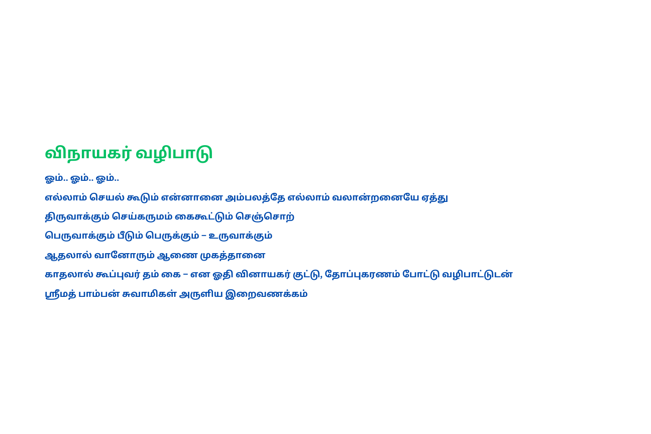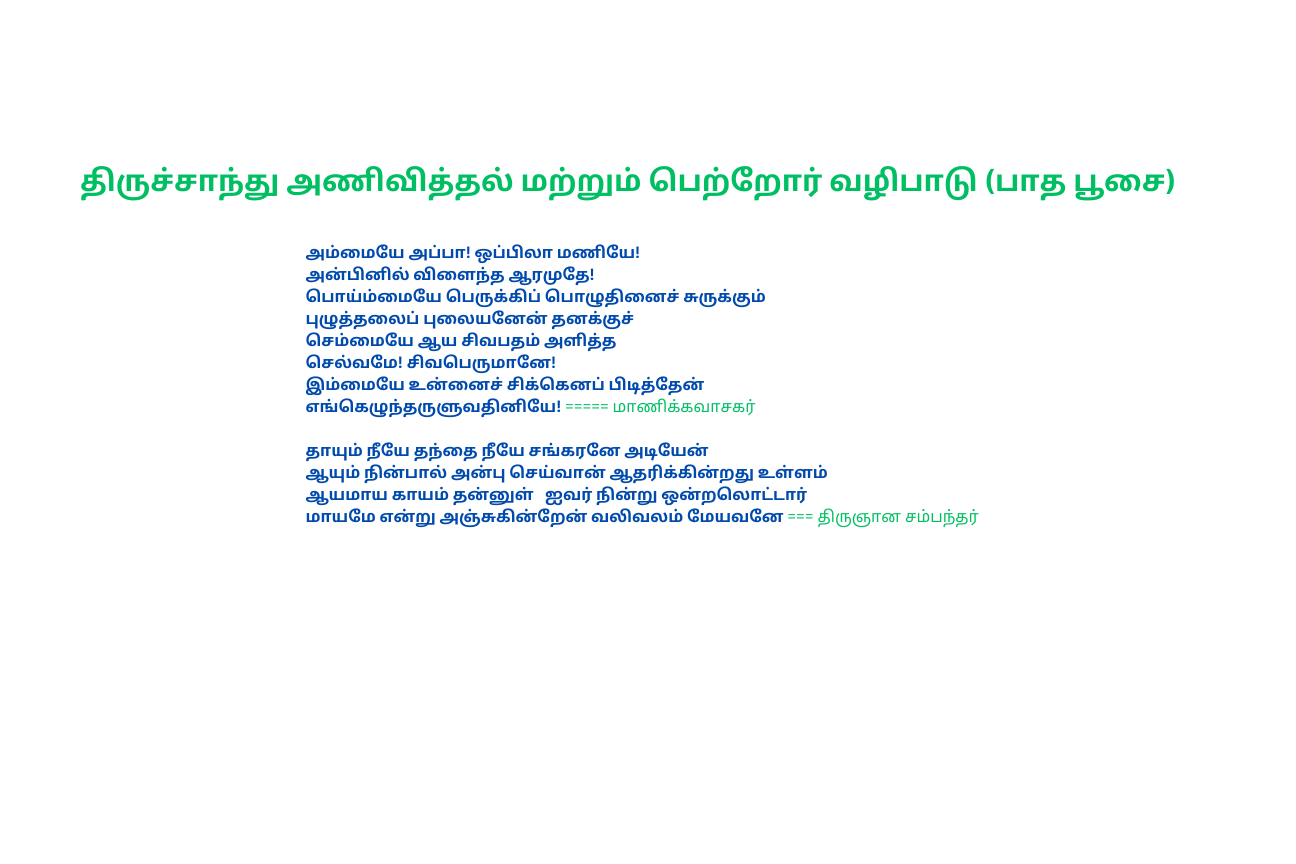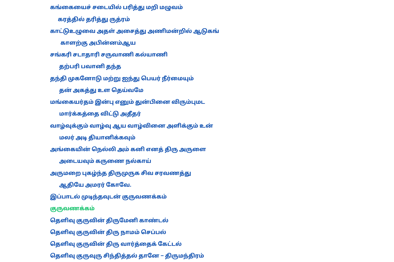 நால்வர் பாடிய தேவாரம், திருவள்ளுவர் இயற்றிய திருக்குறள், திருமூலர் அருளிய திருமந்திரம், அருணகிரிநாதர் அருளிய திருப்புகழ், மற்றும் ஶ்ரீமத் பாம்பன் சுவாமிகள் அருளிய பதிகங்கள் உள் அடக்கியதாகும்.