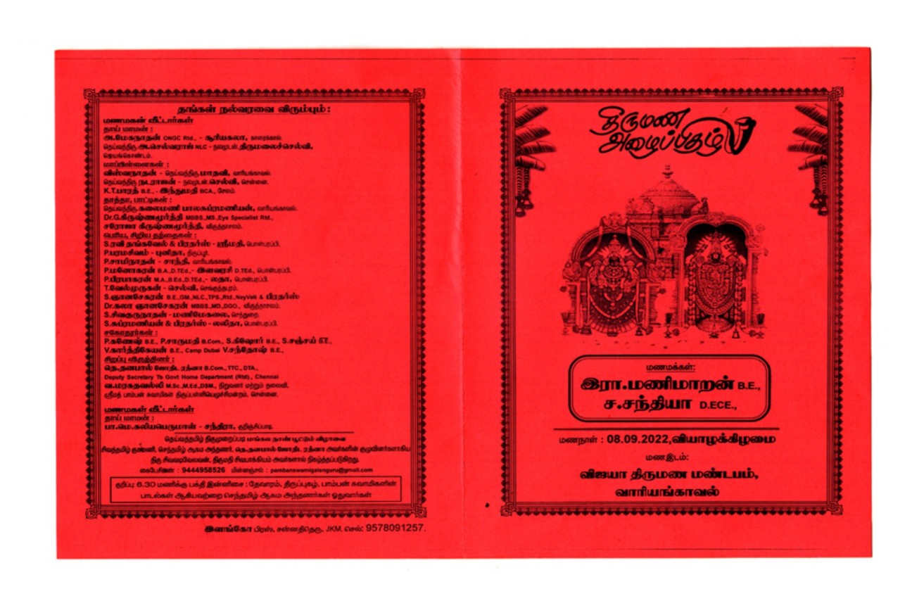 மண இடம்: விஜயா திருமண மண்டபம், வாரியங்காவல், அரியலூர் மாவட்டம்.